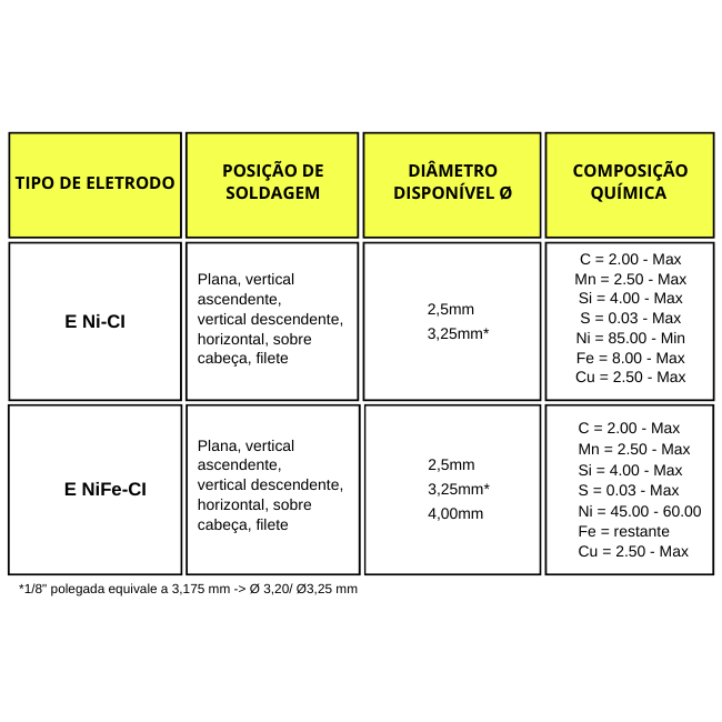 • E Ni-CI – É um eletrodo com núcleo de níquel puro, conforme AWS A5.15 (ENi-CI), indicado para soldagem de ferro fundido sem pré-aquecimento. O metal depositado é dúctil, macio e usinável, permitindo acabamentos precisos. Usado na união com metais diversos e em reparos, inclusive em ferro maleável ou nodular, sob tensões moderadas.