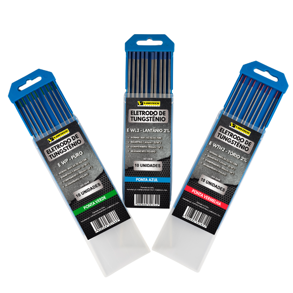 Tungstênio 2% Tório (Ponta Vermelha) Utilizado em aço carbono, inox, cobre, bronze e titânio.