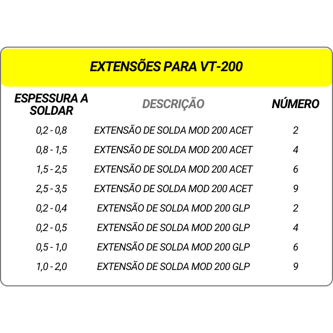 As extensões de solda VT-200, são componentes necessários para utilização nos maçaricos de solda 200, são desenvolvidas em cobre e nos gases Oxi-acetileno ou Oxi-GLP.