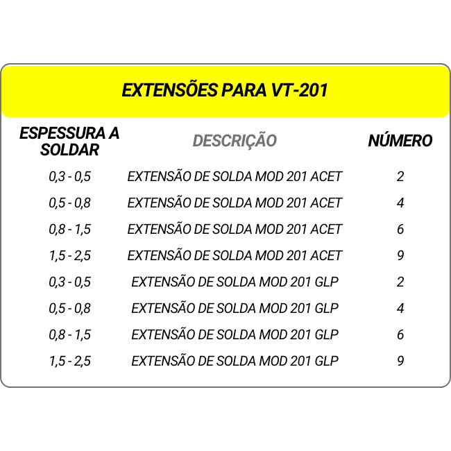 As extensões de solda VT-201, são componentes necessários para utilização nos maçaricos de solda 201, são desenvolvidas em cobre e nos gases Oxi-acetileno ou Oxi-GLP.