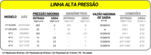 Os reguladores de pressão da Linha Alta Pressão são projetados para aplicações que exigem altas pressões de saída, suportando até 200 kgf/cm². Construídos com componentes de alta tecnologia, são ideais para processos de solda, corte, aquecimento e uso em pressurização de tubulações, refrigeração, enchimento de extintores, caldeiras, estaleiros, siderúrgicas e metalúrgicas.