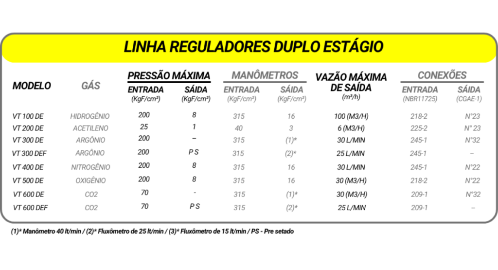 Os Reguladores de pressão da “Linha Duplo estágio”, são desenvolvidos para utilizações onde é necessário um fluxo de gás constante minimizando a variação de pressão e vazão do gás. São utilizados na indústria e em laboratórios, em postos de consumo das instalações centralizadas de diversos gases industriais, em processos de solda, corte, aquecimento e pressurização de cabos. Ideais para utilização em oficinas, caldeiras, laboratórios, serviços de manutenção e metalúrgicas em geral.